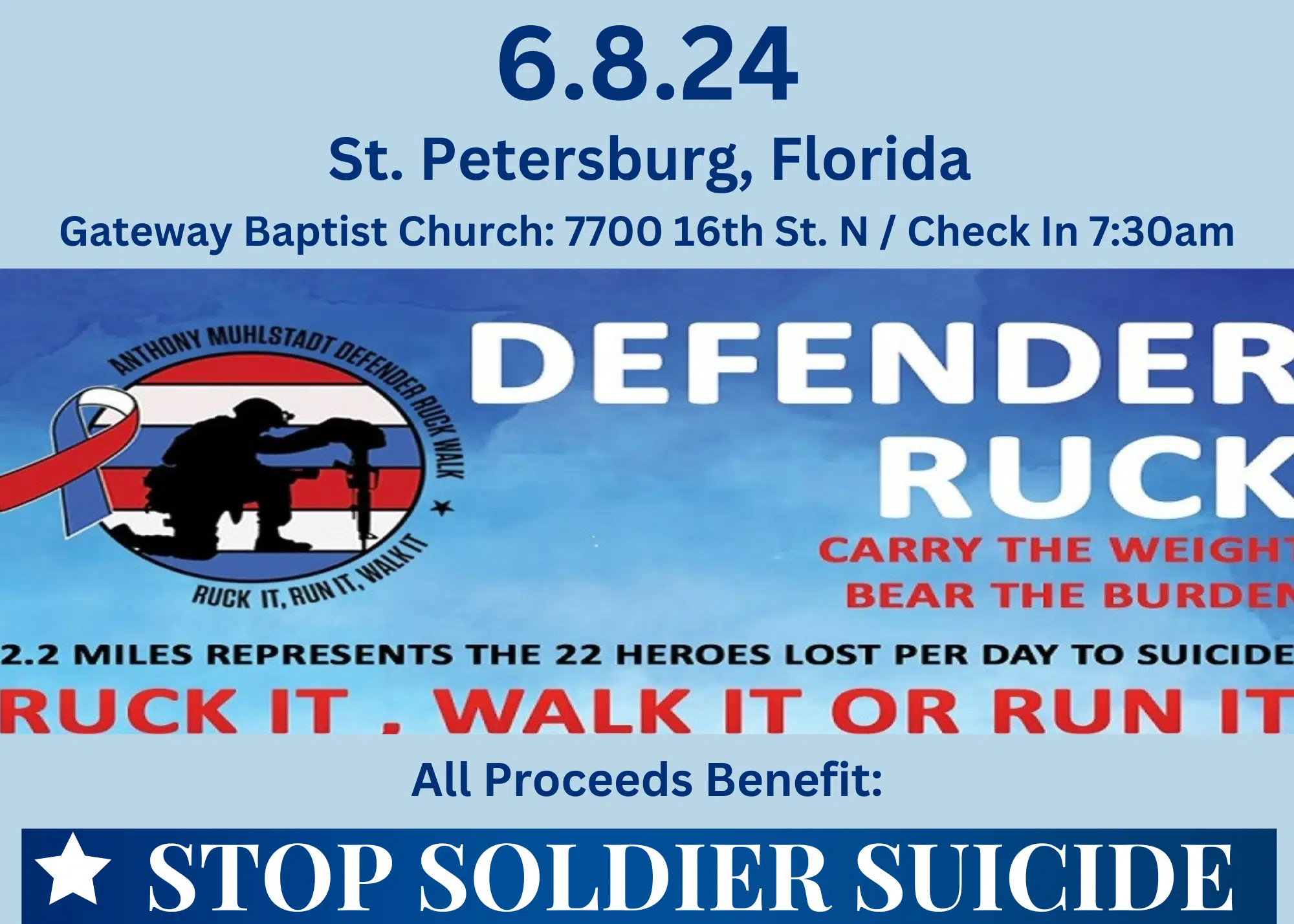 Join the MedBest Team again this year on June 8, 2024 for the second annual Ruck Walk in St. Pete, Florida! All proceeds benefit “Stop Soldier Suicide”.